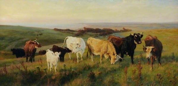 Editor: Here we have William Sidney Cooper's "Herne Bay, Kent," painted in 1892. It’s a pastoral scene with cows in a field, and the thing that really strikes me is how…unremarkable it seems? Given when it was painted, with all the social and political upheaval of the late 19th century, why paint something so...calm? What do you make of this scene? Curator: It's precisely that sense of calm that makes it so compelling when we place it in its historical context. The late 19th century, as you mentioned, was a period of enormous social and political change, particularly in rural England. Paintings like this offered a vision of rural stability at a time of massive agricultural depression. The landed gentry held significant political power. Images such as this perpetuated their values and way of life. Editor: So it’s less a true depiction, and more a piece of propaganda? Curator: Perhaps “propaganda” is too strong a word. Think of it as a visual argument. The artist might not have set out to deliberately mislead anyone, but they were undeniably participating in a larger cultural conversation about the idealization of rural life and, indirectly, reinforcing existing power structures. Does this change how you see the composition? Editor: It does, actually. I initially saw the cows as just cows. Now, I’m wondering if they’re meant to represent something about wealth, or… the perceived prosperity of the countryside? Curator: Precisely. Land meant prosperity, status, and security. Images depicting healthy herds grazing in seemingly endless fields served to visually support that perception, irrespective of the complex socio-economic conditions that were, at that time, impacting England. Editor: Wow, I had no idea that something so apparently bucolic could carry so much weight. Curator: Art always participates in its moment in time, in ways both obvious and subtle. Considering the social and political context is key to a richer understanding. Editor: I’ll definitely be looking at landscapes differently now. Thanks!