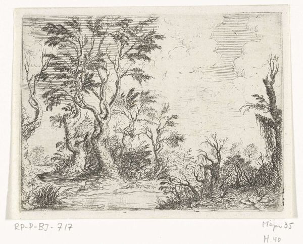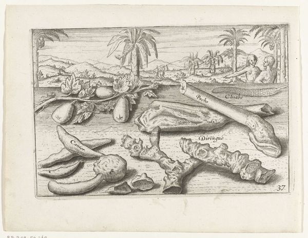 Curator: Let's discuss this intriguing etching titled "Inheemse gewassen van Sumatra," or "Native Plants of Sumatra," dating back to the period of 1597-1646. The artist is, as far as we know, anonymous, but the artwork is currently housed at the Rijksmuseum. Editor: Immediately, I'm struck by the somewhat surreal quality. The precise detail given to the plants clashes a bit with the almost cartoonish hut in the background. It evokes a sense of… a deliberate disconnect. Curator: Yes, it's easy to feel disoriented when considering how images like this participate in colonial power structures and the “discovery” and extraction of resources. Editor: You are so right. And there are visual clues in that direction. The palm on the right, “A”, has prominent, almost totemic nuts. And on the left we have “C”, the other plant seems crowded to the edges. The irises marked with “D”, seem deliberately placed, perhaps implying some kind of value. Curator: This piece definitely seems designed to showcase the resources of Sumatra to a European audience. Look at how the composition leads your eye—from the labeled flora toward that hut, implying settlement. The “native plants” are being presented as elements of trade and potential colonization. Editor: And what about the drawing's technique, the symbolism? It makes me think of the visual language developed to inventory newly ‘discovered’ lands. The plants meticulously rendered in a pseudo-scientific manner. The entire presentation seems focused on creating an image of the exotic, framed by Western ways of seeing. Curator: Precisely! This isn’t just a picture of plants; it’s a depiction shaped by cultural agendas and the visual codes of the time. The almost clinical rendering coexists uneasily with the hint of paradise or Eden… until you examine what lies underneath. Editor: Thinking about those roots—cultural, historical—definitely reframes the image for me. What initially felt naive becomes deliberately crafted. Curator: Exactly. I think exploring this artwork's history and impact gives us insight into a pivotal moment of early global exchange, when natural history and emerging forms of image culture influenced both science and power. Editor: Yes. It definitely invites you to explore layers beyond just the aesthetic appeal, revealing an intricate play of observation, appropriation, and, really, cultural encoding.
