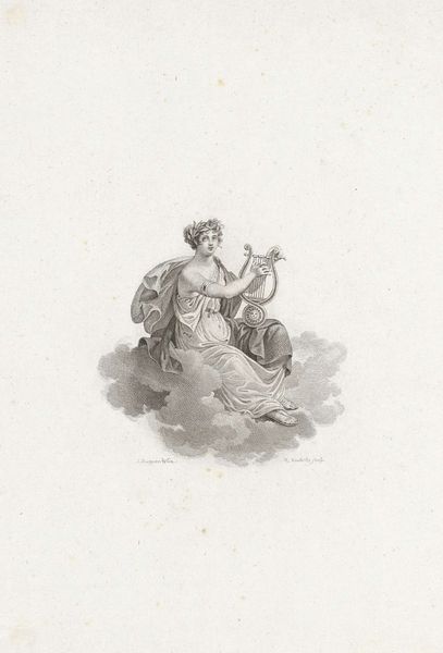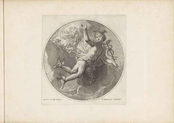 Editor: We're looking at "Putto with Family Crest and Trumpet," an engraving by Reinier Vinkeles, dating from 1751 to 1816. It's a very delicate image – a winged child hovering amongst the clouds, next to a decorated crest. What do you see in this piece, beyond its obvious allegorical elements? Curator: I see a carefully constructed assertion of power, filtered through the soft lens of cherubic innocence. How does the heraldry, often associated with male lineage and authority, become feminized and, in effect, desexualized, by being presented with a Putto? Think about the gendered dynamics at play here. Does the choice to represent power with something innocent critique traditional patriarchal structures, or reinforce them? Editor: That’s interesting, I hadn’t considered the juxtaposition. So the image isn’t simply decorative. Curator: Precisely. Baroque art, even in its seemingly innocuous forms, served to uphold complex social hierarchies. The Putto becomes a carefully-positioned ambassador, softening what could be interpreted as authoritarian declarations, and legitimizing claims of family status. Do you think Vinkeles intentionally chose this cherubic figure? Editor: Perhaps. Or maybe the patron requested the putto to give a specific impression. It definitely gives a different feel than, say, a coat of arms with military symbols. Curator: Exactly. The strategic employment of seemingly innocent symbols allows Baroque art to function as propaganda through the disguise of beauty, and these kinds of prints became an affordable way for merchants to broadcast a chosen narrative of social arrival and permanence. Think of how that connects to social mobility and class anxieties of the time. Editor: It’s fascinating to consider how something so visually gentle can carry so much historical and social weight. It gives me a lot to think about regarding image making in different contexts. Curator: Agreed, exploring these intersections between art history, social structure, and contemporary theories is where art really becomes powerful!