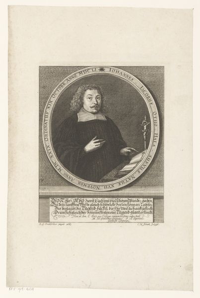 This engraving, "Portret van Henrik Henrikson Horn" was made by Matthäus Merian the Younger. Notice how Merian constructs this portrait using line and form. The oval frame, with its soft curves, encases the stern figure of Henrik Horn. This contrast immediately directs our gaze to the figure himself. The engraver uses hatching and cross-hatching to create a sense of depth and texture, particularly in Horn’s elaborate armor and flowing hair. Below the portrait, the inscription serves as a structural base, anchoring the composition. However, it is not simply a label but part of the overall design. The draped fabric adds a touch of baroque flair. This meticulous attention to detail reflects the period's interest in capturing not just likeness but also the sitter's status and character. The way Merian balances precision with artistic flourish invites us to consider how form can convey power and presence.