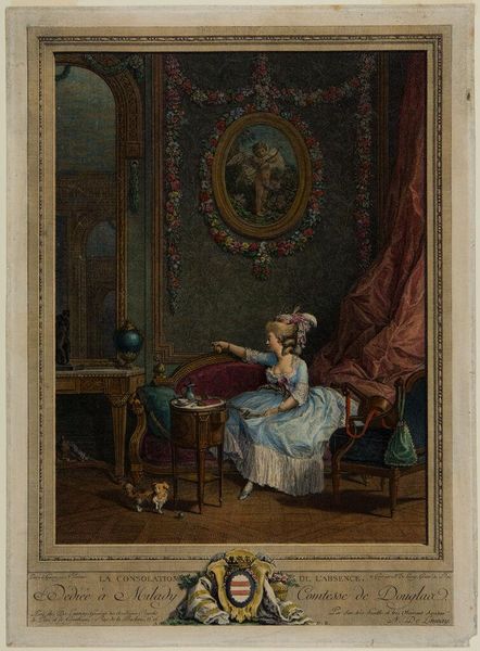 Curator: This is "Daybreak" by Nicolas Delaunay, a hand-colored engraving residing here at the Harvard Art Museums. Editor: It has a rather theatrical feel, doesn't it? Like a scene plucked right from a play, full of secrets and subtle drama. Curator: Note how the composition directs our gaze. The woman at the center, with the aid of her maid, prepares for her day, while a gentleman observes from the periphery. What resonates for you? Editor: It's the tension between public display and private life, isn't it? Her dressing becomes a performance, observed and perhaps judged. It reveals how social position dictated even the most intimate moments. Curator: Exactly! The iconography of the boudoir becomes a stage on which social roles are enacted. We are looking at a potent image of gender and power relations. Editor: The print makes me consider how even casual-seeming art served to reinforce social norms and expectations, carefully calibrated for public consumption. Curator: A provocative snapshot, reminding us how images can reflect and shape our understanding of history.