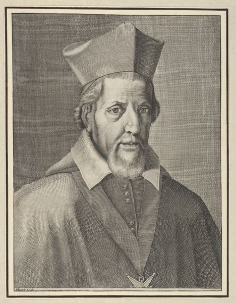 Editor: This engraving, titled "François La Rochefoucauld," is by Michel Lasne. The Baroque-style print presents a serious figure, framed in an oval. I'm curious, what does this portrait say about power and identity in its time? Curator: It’s tempting to view this as a straightforward depiction of nobility, but let's delve into the power dynamics embedded within. Lasne, as the engraver, is already interpreting someone else's vision of La Rochefoucauld, a famous moralist. How do you think the choice of engraving, as opposed to painting, might impact the accessibility and reception of this image and his ideas? Editor: Well, prints could be reproduced and circulated more widely, making the sitter, La Rochefoucauld, and his ideas more visible. Was this portrait intended for a specific audience or purpose beyond commemoration? Curator: Absolutely. Think about the proliferation of portraits during this period. They were often tools for solidifying social standing, political alliances, and even shaping public opinion. The ornate frame and the aristocratic garments—these aren’t merely aesthetic choices. What cultural narratives do they reinforce, and potentially, what voices do they silence? The order hanging on his chest would speak of his allegiances to the Royal Orders of the day and the small coat of arms adds another layer to the complexities and nuances. Editor: I never thought of a portrait as actively silencing certain groups. But of course, highlighting aristocratic figures reinforces existing hierarchies. This makes me reconsider my initial impressions of formality. Curator: Exactly. It encourages us to move past a purely aesthetic appreciation and instead critically examine the ideologies that these images propagate. Editor: Thanks. I'll certainly look at portraits, and other art, with a fresh perspective moving forward. Curator: And remember, understanding art means understanding the social tapestry from which it emerges and which it reinforces.