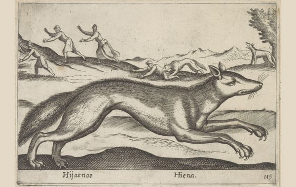 Curator: Today, we're examining "Hyena," an engraving crafted by Antonio Tempesta before 1650. You can find it here at the Rijksmuseum. Editor: It strikes me as delightfully strange! Like a lion decided to moonlight as a dog. There's something both majestic and unsettling about its posture. What’s going on in the landscape behind the large central Hyena? Curator: The landscape functions as an integral component of the overall composition. The undulating lines of the terrain and sparse foliage complement the creature's form. And in the background is a second hyena seemingly scavenging a corpse! Note the stark contrasts between the areas of dense hatching versus the open, untouched space that serve to delineate form and suggest the fall of light, creating a dynamic visual field. Editor: Good eye for those little macabre details! I suppose the intention wasn't to romanticize, but more about portraying a realistic view—even in a slightly stiff, Baroque way—of an animal. I am curious, though, how did someone get close enough to one of these creatures before the days of safaris? Curator: Perhaps Tempesta studied a taxidermied specimen or relied on sketches from travelers? Its slight anatomical awkwardness adds to its unique charm. Also consider, the printmaking process itself. Engraving demands a high level of control; the artist is literally carving out light and shadow. Editor: True! Each line so deliberately placed, a miniature epic. Despite the stiffness, it vibrates with that labor and concentration. Knowing all that elevates it; you’re looking not just at a hyena, but a whole mindset and the process that delivers its truth. Curator: Precisely. And while realism may be at play here, a contemporary reading might uncover further layers. The strategic rendering of this "Hyena" also embodies core aspects of Baroque aesthetics. Editor: From odd beast to intricate symbol... Thank you for untangling it! Curator: A pleasure. Looking closely really unlocks its secrets.