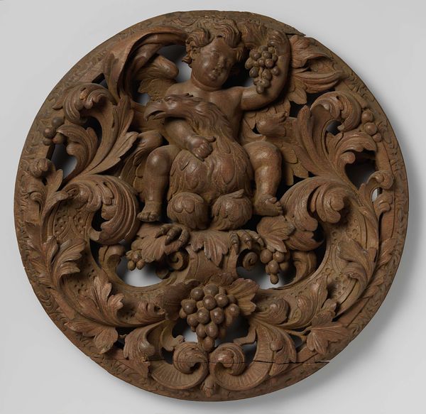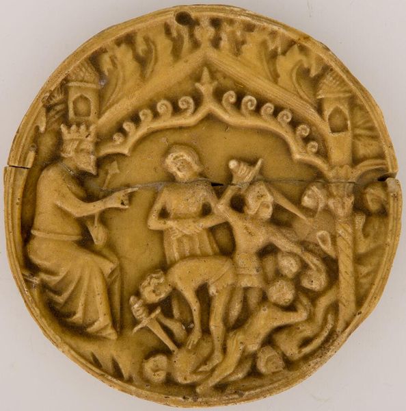 Curator: This small but intricate piece is titled "Head of a Bishop's Crosier," and it resides here at the Harvard Art Museums. The maker is, alas, unknown. Editor: It feels ancient and earthy, doesn't it? Like a fossil unearthed from some forgotten garden, a silent testament to devotion. Curator: Exactly. Notice how the unknown artist has contained the bishop within a field of stylized foliage; the crosier grounds him but also elevates him. It's a dance of earthly and divine. Editor: I love how the line of the crosier bisects the composition, drawing the eye upwards, almost like an arrow pointing to the heavens. There's something incredibly deliberate in the placement. Curator: And the way his hand is raised in blessing? It’s an invitation, a promise of grace. I find that the size belies its power; it shrinks the distance between us and something deeply spiritual. Editor: It's a beautiful reminder that even the smallest objects can contain worlds of meaning. Curator: Yes. A tiny window onto faith, history, and the enduring power of art.