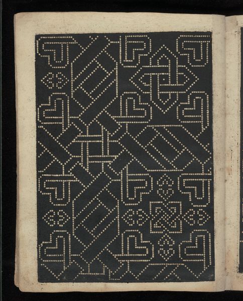 Curator: Looking at this densely patterned page, I’m struck by the intensity of the black and white contrast. The geometric forms seem to vibrate on the page. Editor: This is page 17 from *Libbretto nouellamete composto per maestro Domenico da Sera...lauorare di ogni sorte di punti*, a print created by Domenico da Sera in 1532. It resides here at The Met. Curator: 1532. So, squarely within the Italian Renaissance. And what an intriguing object. A manual, essentially, offering patterns for needlework. Who was its intended audience, and what does this say about the place of women and domestic crafts in Renaissance society? Were these patterns accessible across class lines, or did they become another marker of status? Editor: Excellent points. We could delve into that socio-economic terrain. But let’s not overlook the power of this visual arrangement. Each small square contributes to a greater geometric framework. It presents a microcosm of visual organization—symmetry, repetition, and variation working in careful harmony. Note how individual motifs build up to the overall schema. Curator: Absolutely. But consider also how these patterns—seemingly decorative—were in fact instruments of empowerment for women. Needlework was not merely a pastime, but a means of self-expression, storytelling, and even, subtly, of challenging societal norms through coded symbols or personal embellishments. This book becomes more than just a collection of designs; it's a silent witness to the lives and creative agency of women. Editor: A fascinating perspective. I still think the rigorous deployment of pattern creates a sense of stability, even rigidity. Consider the interplay between positive and negative space: how the balance achieves resolution across the composition. The artist achieves compelling tension between stasis and flow using very simple shapes. Curator: A rigidity perhaps reflecting the constraints placed upon women, yet countered by the act of creation itself? These repeated motifs were not mere echoes but iterative explorations offering pathways for inventive variation. The print offered direction, and liberated women's voices. Editor: It also shows us the possibilities for complexity available within limitation. Thanks to the framework offered by Sera, we both came to richer understandings.