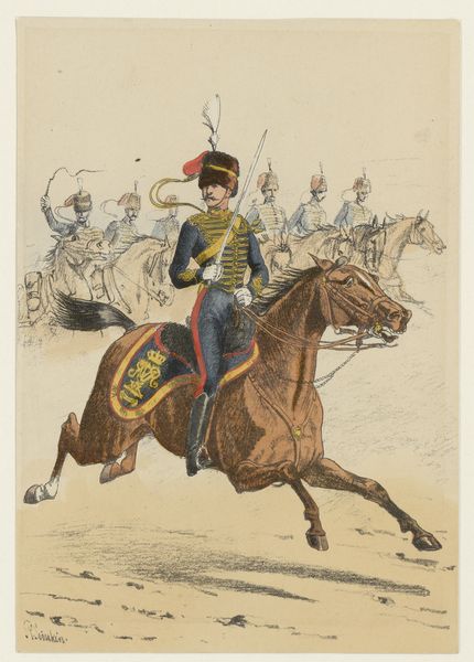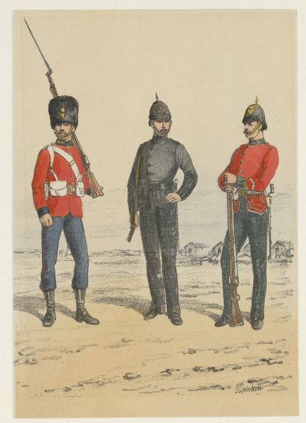 Richard Simkin created this print of two British military men in uniform at an unknown date. Simkin was an artist known for his illustrations of the British military, and his works often reflect the prevailing attitudes towards empire, duty, and class distinctions of his time. In this image, we see not just soldiers, but symbols of British power and identity. The uniforms, meticulously detailed, speak to a rigid social hierarchy and the visual spectacle of military presence. The soldier on horseback, elevated both literally and figuratively, embodies authority and control, while the foot soldier stands as a figure of steadfast loyalty. Simkin's art invites us to consider the human cost of empire, and the identities forged in its service. He was celebrated for his accuracy, yet his work also perpetuates a certain vision of British military might. What do you feel when you consider the legacies of colonialism, of which these soldiers were a part?