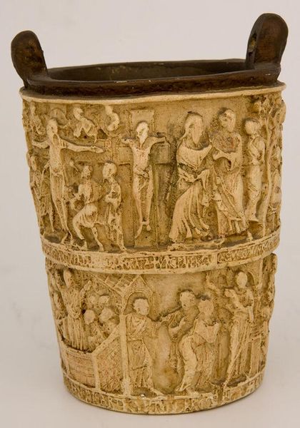 Editor: Here we have a 16th-century goblet, a "Facsimile of Liberal Arts Goblet," artist unknown. The bronze or brass is so ornate; it's amazing. What can you tell us about how it was made? Curator: Look closely at the casting and chasing. It speaks volumes about skilled labor and workshop practices of the era. This wasn't just art; it was a product of specific social and economic forces. Who would have commissioned such a piece, and why? Editor: Someone wealthy, surely, to display their status and knowledge? Curator: Precisely. The material itself – the bronze, the labor – reveals the relationship between art, consumption, and power in Renaissance society. It's less about individual genius, more about a system. Editor: So, seeing the piece this way makes you consider its social implications more than the skill it took to make? Curator: Both are integral, but understanding the means of production deepens our appreciation of its historical context and what it represented. Editor: That’s a different lens than I usually use, I appreciate it. Curator: Glad to offer a new perspective. It encourages us to question the very definition of ‘art.’
