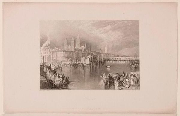 Curator: Edward Goodall's print, "Westminster Abbey and Bridge," captures a scene brimming with activity. It feels almost dreamlike. Editor: It does. And one can immediately sense the potent symbolism of the Abbey juxtaposed with the bustling river. The Thames becomes a stage for power and ceremony. Curator: Right—the bridge, the watercraft, and the Abbey serve as symbolic anchors, each layered with cultural and historical significance. The architecture provides a sense of permanence. Editor: While the boats hint at the constant flux of society. The river itself can be seen as a metaphor for the passage of time, and the human drama played out on its surface. Curator: Indeed, and the details in the ships' flags and costumes suggest a very specific historical event being memorialized here. An event of great social importance. Editor: These displays always reveal who is included and who is excluded. What narratives are elevated and which are intentionally obscured. Curator: Very true. So much to consider within a seemingly simple scene. Editor: Absolutely, art invites us to continuously reflect on power, narrative, and our place within the ongoing story.