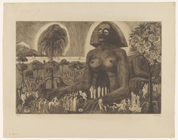 Editor: This is Paul Gauguin's "Te atua (The God), from the Noa Noa Suite," created between 1893 and 1894. It's a print, a woodcut I think, on paper, and looking at the composition and the color palette it evokes such a strong spiritual quality. What do you see in this piece from a formalist perspective? Curator: Observe how Gauguin employs line and form to construct meaning. The arrangement of figures into three distinct, haloed sections emphasizes a tripartite structure that governs the entire image. Editor: So, the figures are deliberately compartmentalized. How does that relate to the title "The God"? Curator: Exactly. And that monochromatic color scheme does not diminish from this. The print emphasizes stark tonal contrasts. We have light against shadow that draws the viewer's gaze to different focal points, but note also the varying texture achieved through the carving process. Does the visual arrangement invite certain interpretations, given the historical and artistic context of Gauguin's practice? Editor: I'm thinking about the concept of "primitivism," the art movement in this context is looking at so-called "primitive" societies to reimagine artistic styles in the western canon. The piece doesn’t quite sit right if you see it from the post-colonial point of view. The work also feels… simplified, abstracted, in a way that rejects academic tradition, but the effect romanticizes and flattens something very complicated. What is lost by stylistically "simplifying" a complex cultural system of indigenous peoples? Curator: Excellent question. Look closely how line and texture dictate spatial relationships within the artwork itself. This artistic interpretation is valid insofar as it informs a conversation concerning aesthetic expression within clearly established parameters of form, medium, and stylistic evolution. And by the stark forms does the arrangement create emotional effects beyond what the context may or may not inspire? Editor: It’s a perspective I had not fully considered! It’s easy to fixate on context alone and not see what is happening visually. Curator: Exactly, always attend to the way it looks and is structured, first and foremost.