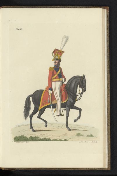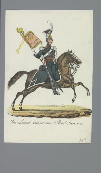 Curator: This piece is called "Lancier," created between 1835 and 1850, and currently residing here at the Rijksmuseum. It's a drawing using watercolor and colored pencil on paper, made by Albertus Verhoesen. As the title suggests, it depicts a lancer, a type of cavalry soldier. Editor: My first impression is this has real storybook charm! It feels quite formal but also slightly… dreamlike. The colors are muted, but the uniform details are so precise, like a meticulously crafted toy soldier on a slightly faded page. Curator: Indeed, the precision speaks to its time. We should consider the political backdrop. Europe, during the period between 1815 and 1914, experienced relative peace but saw increased production of military uniforms as potent symbols of state power. The lancer, in his full regalia, would have embodied ideas of order, discipline, and perhaps even national identity. Editor: I hadn’t thought of that, but the uniform is so ornate it feels almost performative, like this lancer is starring in his own little pageant. Does his uniform reveal clues about his social status? The quality of the dyes, for instance? Curator: Absolutely. Color production and fabric were highly regulated industries that would allow the trained eye to determine social class and also offer some insight into trade and other materials of importance during that time. The bright colors and elaborate detailing suggests a higher rank, maybe a junior officer? Beyond mere class, the lancer's garb would have been very revealing about ethnicity, religion, national identity and military ranking in the Netherlands, which are powerful notions still worth considering today. Editor: This image triggers the sense that this person may have gone off to battle, perhaps never returned to their home. It gives me the feels, do you know what I mean? It's got that quiet sadness. Curator: I think you've articulated something quite important about genre-painting as a site to examine emotions of the human spirit that extend beyond one individual to speak to communities touched by experiences of war, sacrifice and social change. Editor: Right. It really does connect us, across all this time! Curator: Precisely. Albertus Verhoesen allows us to connect emotionally but also contextualizes ideas and social forces that continue to influence us even now.