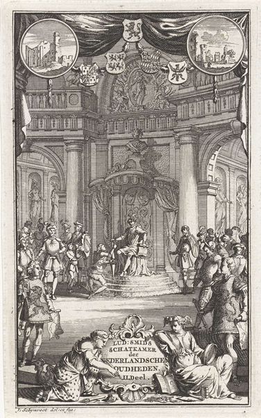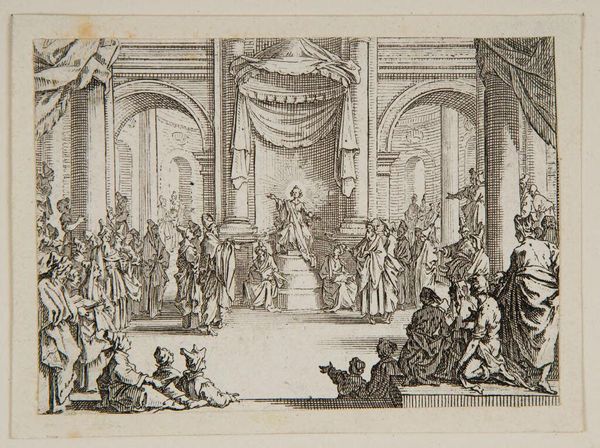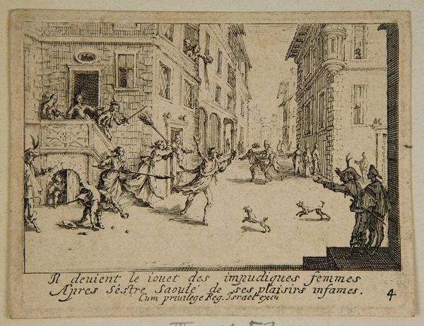 Curator: Ah, "The Feast" by Jacques Callot. Look at the detail in this tiny world! Editor: My eye is immediately drawn to the contrast between the bustling foreground and the serene, almost theatrical, dinner scene. It feels…disjointed, somehow. Curator: Well, that's Callot for you. He etched this, probably using a hard ground, to achieve such clean, precise lines. Consider the labor involved in depicting such a vibrant and aristocratic gathering. Editor: Exactly! And what materials were they consuming? What was the cost of that celebration? It’s a portrait of power, displayed materially. Curator: For me, it's more about the subtle energy, the almost chaotic dance between order and revelry. The light feels like a character itself. Editor: Maybe... but thinking about the printing process and the societal backdrop grounds that energy for me. Curator: In the end, this tiny world reminds us of the grand, fleeting dramas of life. Editor: And the material realities upon which those dramas were staged. A tiny document of grand consumption!