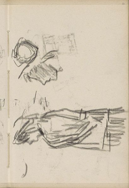 Editor: So, this is George Hendrik Breitner’s “Twee vrouwen, op de rug gezien,” or “Two Women, Seen from the Back,” made around 1893-1894. It’s a drawing, looks like pencil on toned paper, currently held at the Rijksmuseum. It feels incredibly intimate, like a stolen glance. What strikes you most about this piece? Curator: Well, considering Breitner’s broader body of work, and the cultural context of the late 19th century, I see a snapshot of the burgeoning, yet often concealed, female experience in a rapidly modernizing Amsterdam. These women, presented anonymously from behind, become almost archetypes. Do you think that Breitner was sympathetic towards them? Editor: That’s interesting! I hadn’t really considered it from that perspective. I was more focused on the raw, almost unfinished quality of the sketch. The fact it is drawn in a notebook makes it feel immediate and spontaneous. Curator: Precisely! But where was this spontaneity coming from? Breitner was deeply embedded in the social realities of his time. He wasn't just capturing what he saw; he was participating in the evolving visual language around class, gender, and the changing urban landscape. Was it accepted for women to be outside and visible at this time? How does his impressionism align or diverge from others focusing on images of women in Paris? Editor: I guess it hints at the social dynamics he was engaging with as well, trying to portray the reality that surrounded him. The medium reflects the message. Curator: Exactly! This piece is more than just a drawing; it’s a social document and a visual manifesto. It raises questions about who has the right to representation, and in what form. Editor: It’s amazing how much can be unpacked from a simple sketch. Thanks! Curator: My pleasure. Now, imagine how these women themselves might have interpreted this representation. That's where the real history begins, isn't it?