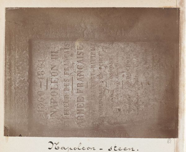 Curator: Right, let's dive in. We're looking at "Elliot Marbles" by Linnaeus Tripe, created around 1859. It seems to be a photograph of some kind of inscribed stone. What's your first impression? Editor: My first impression is texture. I mean, look at the stone itself! It feels aged, almost like parchment, the lettering an organic part of it. There’s something melancholic about seeing ancient scripts rendered so starkly, like a message floating through time, just barely clinging to visibility. Curator: It’s a fantastic study in contrasts actually. Tripe uses light and shadow to define these chiseled characters against the rough-hewn surface, and also to create that sensation of a thing weathered and aged, so we read that temporal quality you noted. Do you get a sense of what those markings might mean? Editor: Well, beyond a gorgeous composition, as an activist, it always comes back to: whose story is being told here, and whose voices have been left unheard. Looking at that writing, the lines so deliberately carved… I can’t help but think about the labor involved in creating such an artifact and also, the sociopolitical structures that led to its creation. What did it mean for someone to immortalize their words in this way? Who held the power of the pen, or in this case, the chisel? Curator: Precisely. Considering Tripe was working in India at the time, commissioned by the British East India Company, it brings a specific perspective to his choice of subject. He documented these ruins meticulously, yes, but through a colonial lens. Was he fascinated by a lost culture, or was he merely cataloging spoils? Editor: It’s that tightrope walk, isn’t it? On the one hand, these images allow us to bear witness, to have conversations about legacies and power dynamics; but on the other, photography, from its beginnings, has been bound up with objectification and control. And how do we contend with these layers when looking at what is beautiful and thought provoking in the process of preservation? Curator: You bring up such a potent point. This image, then, becomes a provocation rather than just a document. Its stillness holds so much potential energy, and as we look closely, our awareness can transform that frozen moment into an impetus to question our place in that continued telling and retelling. Editor: Absolutely. Seeing Tripe's photograph prompts me to consider that legacy but it is more a beginning than an end. This isn’t just about gazing back, it’s about seeing how the echoes of those pasts reverberate now, pushing us toward a future that critically engages with representation, history, and the enduring quest for understanding.