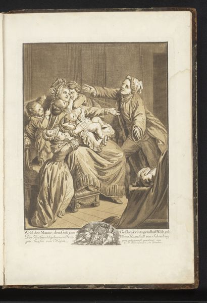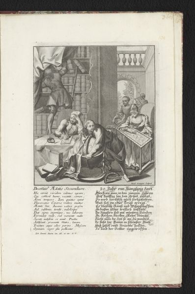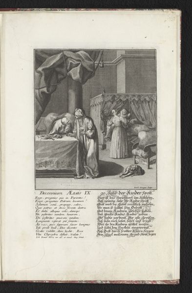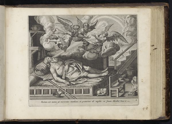 Curator: Here we have "Filippo Neri Sees Two Angels" by Luca Ciamberlano, created between 1630 and 1641. This Baroque engraving is currently housed in the Rijksmuseum. The image depicts a saint in what appears to be a sick room receiving a divine vision. What are your initial thoughts on this work? Editor: Well, I'm immediately struck by the contrast of textures, how Ciamberlano uses cross-hatching to suggest everything from the coarse cloth of the kneeling figure’s trousers to the ethereal softness of the angels' wings. It is interesting to examine the layering, even the lines making up their facial figures. Curator: Precisely! And the composition is ingeniously arranged, isn't it? Notice how the artist uses the horizontal line of the bed to divide the earthly and celestial realms. Above, we have the dynamism of the angels; below, the solemn stillness of the deathbed scene. The implied verticality draws the eye upward, creating a visual ascent. Editor: I think it is critical to consider what type of press and plate were required to create the levels of shading on display. Also the acidic chemical processing is clearly very nuanced. What level of artisanal skill do we imagine went into the process? And, how are these skilled artisans valued by their contemporaries? Curator: Good point. We must acknowledge the craftsmanship involved. It seems the contrast emphasizes both the subject of transcendence but also that the hand of the artist, guided by their own creative spirit, produced the engraving itself. Editor: This connects well to my broader view that it's equally important to look beyond the formal aspects and consider this print as a produced commodity in Baroque society. This print, in its multiple instances, connects a message to multiple consumers of this narrative. Curator: Certainly. The narrative of Filippo Neri’s vision is effectively conveyed through the precise linework. It has successfully triggered contemplation within the confines of its own artistic language. Editor: Ultimately, I see a compelling dialogue between spiritual storytelling and the tangible realities of material production. Both facets shape how we experience and interpret this Baroque print.