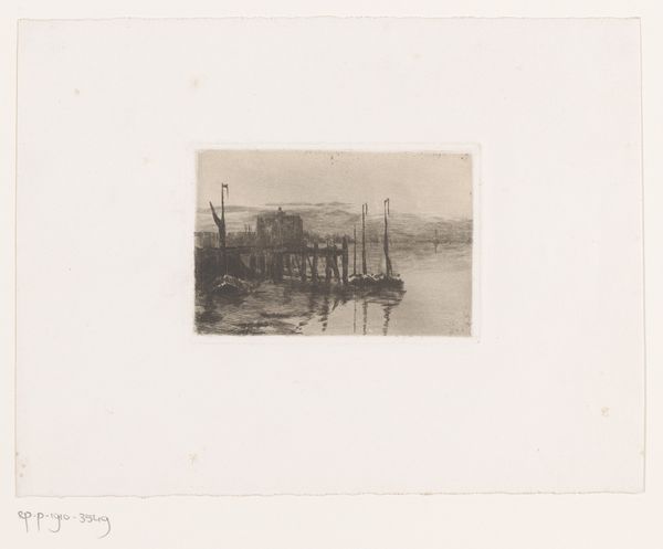 Curator: Here we have "Gezicht op de Nieuwe Haven in Dordrecht," or "View of the New Harbor in Dordrecht," an etching by Willem Witsen, created around 1899-1900. It’s currently held here at the Rijksmuseum. Editor: It's quite striking. There's a stillness, almost a solemnity to the scene despite it depicting a bustling harbor. The muted tones emphasize the water and the way it reflects the city’s architecture. Curator: Witsen was deeply embedded in the art circles of his time, particularly the Amsterdam Impressionists. This work reflects a fascination with capturing atmospheric effects, much like his contemporaries. He also came from a position of wealth, with connections that helped him gain exposure in prestigious venues, playing an active role in promoting art. Editor: Yes, the etching technique is masterful. The use of line and shadow gives the buildings, especially the church tower, a sense of age and permanence. The tower looming over the scene almost evokes a feeling of spiritual watchfulness over the city, a symbol of endurance, reflecting the cultural memory embedded within the city’s visual identity. Curator: Dordrecht has always been a strategically and economically important city in the Netherlands, playing a role in major historical moments and Witsen’s decision to portray it isn’t accidental. Such scenes cemented ideas of Dutch identity, offering reassuring imagery to a nation grappling with modernization and shifting social structures. Editor: And the water, constantly in flux, mirrors the changing nature of time and history, a reflective surface showing a slightly distorted but nonetheless present reality. I read the composition also as speaking to Dordrecht as a site of transition and connectivity through the maritime activities. Curator: Precisely. Witsen’s composition frames the city from across the water, and this emphasizes its role as a trade hub, connecting Dordrecht to wider economic networks. Editor: I find that the beauty in such art pieces stems from the quiet contemplation it invites. It reveals how much depth is contained within seemingly simple representations of our surroundings. Curator: Indeed. And exploring it highlights art's enduring relevance, particularly in interpreting the forces that shape our environment, our history, and our identity.
