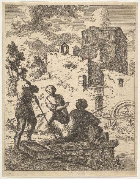 Editor: Here we have Adriaen van Ostade's "Traveling Musicians," estimated between 1610 and 1685. It's an etching in ink, and the scene feels so lively despite the monochrome palette. What’s your take on this bustling performance? Curator: Well, consider the social context of 17th-century Netherlands. Genre scenes like this gained popularity as the middle class expanded, seeking reflections of their everyday lives. The public role of art shifted towards depicting these narratives. How do you think this etching fits into that cultural landscape? Editor: It seems to be celebrating the joy of common life, with its musicians entertaining a crowd outside what looks like a modest home. Curator: Precisely. Now, consider the political undertones. Was it simply capturing reality, or perhaps idealizing a certain simplicity? Etchings, like prints, also had much wider circulation than unique artworks, and so the messages or cultural information they contained spread more broadly too. Editor: So, the print format itself had a political effect? The etching is interesting, almost a snapshot, do you see it challenging ideas about fine art versus everyday art? Curator: It certainly blurred the lines, offering an accessible art form with accessible subjects. That accessibility played a crucial role in shaping public taste and expectations of art's purpose, it really places art in service to society! I wonder, reflecting on this, do you see parallels in contemporary art practices? Editor: That's an interesting way of thinking about it; maybe street art would be a valid contemporary connection to make about reaching everyday society through public and accessible artwork. It enriches my view quite a bit, especially recognizing its historical context.
