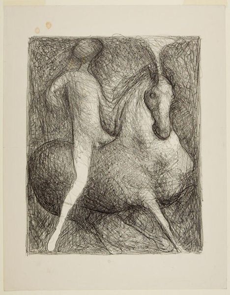 Curator: This is "Cavallo di Forma" by Marino Marini, part of the collection at the Harvard Art Museums. Editor: It feels almost ghostly, doesn't it? Like a horse emerging from fog. The texture is quite striking. Curator: Marini was fascinated by the relationship between humans and horses, particularly the sense of tension and balance. You can see it in the deliberate, almost rough handling of the materials. Editor: I'm drawn to the marks themselves. The process seems so present. It looks like charcoal or a similar medium, worked and reworked to build up the form. It feels incredibly direct, almost primal. Curator: Indeed. Marini explored these themes throughout his career, capturing the shifting dynamics of modernity, the unease and uncertainty, in this ancient pairing of man and beast. Editor: The starkness definitely stays with you. It reminds me that art isn't just about the image; it's about the hands that made it.