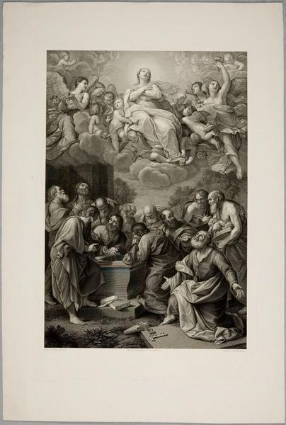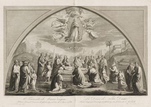 Curator: The emotional tenor of this piece strikes me first; the subtle gradations of light and shadow seem to amplify a sense of awe and reverence. Editor: Indeed. What you're perceiving is Domenico Cunego’s "Assumption of the Virgin", now housed at the Harvard Art Museums. Cunego, who lived from 1726 to 1803, captured a transformative moment in Christian iconography. Curator: It is a powerful depiction. The upward gazes are interesting – that shared direction indicates a collective hope or belief. Editor: The Virgin's ascent, surrounded by cherubic figures, is a classic symbol of triumph over earthly limitations, really emphasizing the Catholic church's narrative of the immaculate conception and bodily assumption. Curator: And that empty tomb below, so stark against the radiant sky, highlights not just the Virgin's departure, but a transformation, a movement into a different realm. Editor: It's a compelling representation, a visual distillation of faith intended to stir devotion. Curator: Agreed. A poignant image, then, capturing a profound spiritual transition. Editor: A powerful reminder of art’s role in shaping both individual belief and broader cultural narratives.