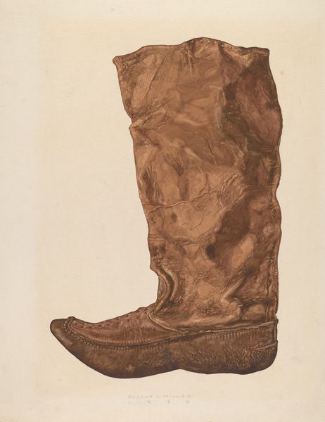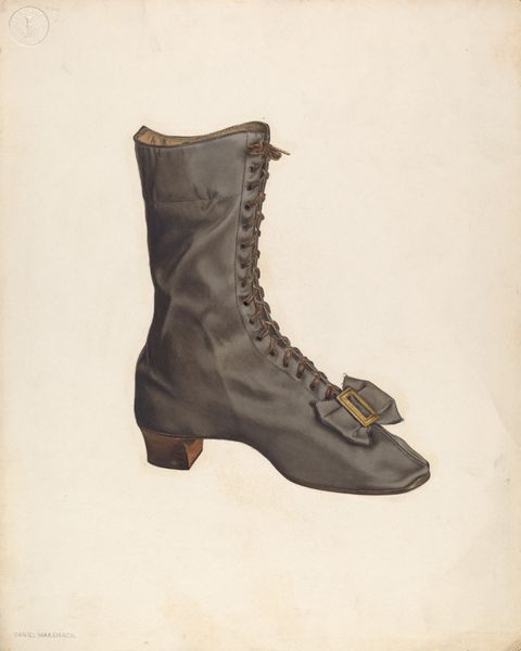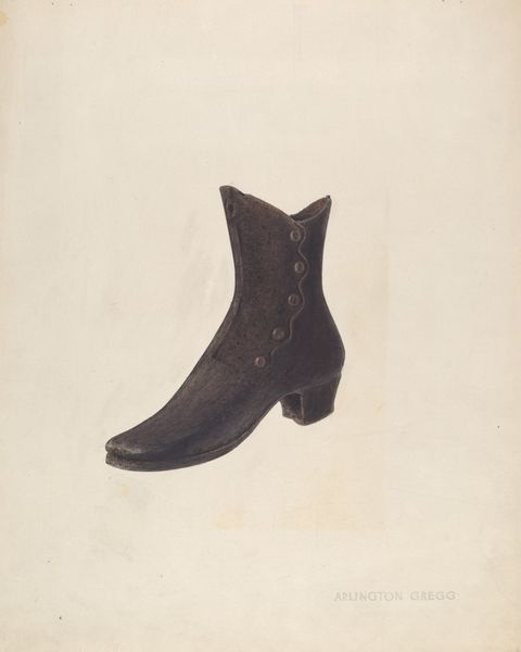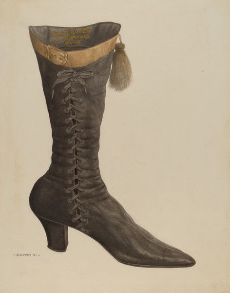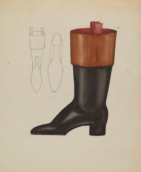 Editor: Here we have Alice Stearns' "Boot Shop Sign," likely created around 1937. It appears to be a combination of drawing and painting techniques, perhaps watercolor and charcoal. There's a certain straightforwardness to it. What catches your eye in terms of interpreting the work's meaning or context? Curator: Well, immediately I’m drawn to considering it beyond just a sign for a shop. Think about the cultural weight of the cowboy boot itself, particularly in 1937. What does this object represent within a wider American narrative, particularly during the Great Depression? Is this an aspirational image? A symbol of resilience, perhaps? Editor: So you're saying it's more than just advertising, that it taps into a broader cultural identity? I hadn't considered the aspirational aspect. Curator: Exactly. And whose aspiration are we talking about? The cowboy myth has always been a complex one, intertwined with ideas of rugged individualism, frontier expansion, and, of course, the displacement and erasure of indigenous communities. How does displaying it change with time? What might the artist be signaling by choosing this specific icon at that specific moment in American history? The clean line quality in the medium could reflect the hope of prosperity but also references the commerciality of the cowboy persona. Editor: That’s fascinating. I was initially seeing it as a fairly simple commercial image, but the connection to larger themes of American identity and economic hardship really reframes it. Thanks for the insight. Curator: Of course. And don't forget to ask yourself: who gets to wear this boot, both literally and metaphorically? Art is a constant conversation across time.