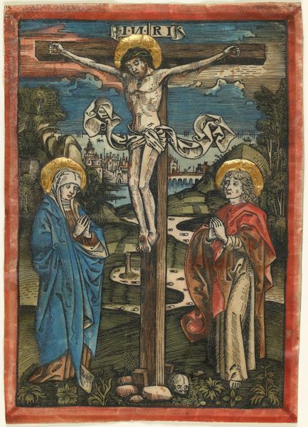 Curator: Looking at this painting, what strikes you immediately? Editor: The sheer emotional density. It's almost suffocating, especially the cluster of faces below the cross. You can feel the weight of collective grief and malice. And that dog in the right-hand corner only intensifies that sensation—perhaps it’s symbolic of abandonment. Curator: Yes, I agree. We are viewing The Crucifixion, an extraordinary work likely rendered in tempera during the early 1480s. This evocative piece comes to us courtesy of the Housebook Master, a German artist active in the late fifteenth century. Editor: The positioning of Christ above such blatant suffering creates a harrowing juxtaposition. It’s very cleverly arranged from a power and political standpoint, where social class seems especially reinforced. The helmet, skull, and dog imply war, violence, and, potentially, a decaying nobility as spectators in this historical event. What meaning might that hold? Curator: That arrangement certainly creates a powerful symbolic tension. Note how the artist employs an older style to communicate deep spiritual meaning through Christ, such as a direct visual reference of sacrifice and suffering through the iconographic representation of the instruments and agents involved in Christ's ordeal. Even in its most agonizing imagery, we find a familiar visual and psychological terrain, which allows the painting to access cultural memory that influences one's belief system over centuries. Editor: That tension makes me think about the artist's position—complicit or critical? Is this merely a depiction of a historical event that mirrors medieval class disparities or a subtle critique of that power structure, of using suffering to reinforce societal stratification? And is Christ intentionally rendered powerless atop the cross? I suppose our viewpoints depend on personal factors, perhaps even one's cultural memory. Curator: Absolutely. What this work achieves, I feel, is a certain depth, a resonance with the themes of sacrifice and grief—which explains why it has continued to captivate viewers throughout time. Editor: Indeed. And the way it invites us to grapple with historical power dynamics ensures it will continue sparking complex, essential conversations. The collective expressions are a somber warning for things we have yet to confront today.