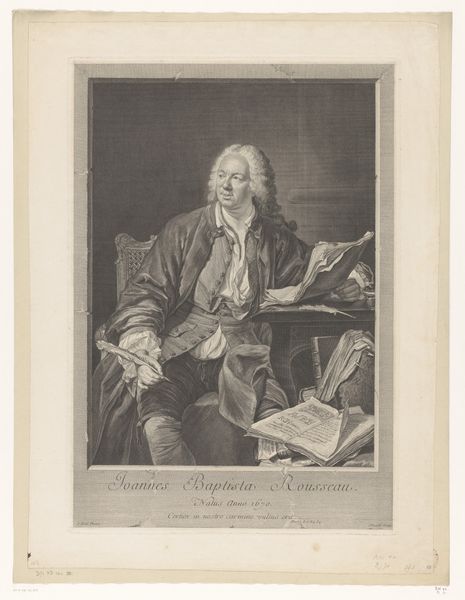 Editor: So, this is "Portrait of Laurence Sterne" from around 1760-1762, an engraving by Edward Fisher after Joshua Reynolds. There's a pensive mood, maybe a touch of melancholy about it. What do you see in this piece, especially considering its historical context? Curator: Immediately, I’m drawn to how this portrait negotiates power and intellectualism in the 18th century. Think about Sterne himself, a celebrated author but also a clergyman. How does Fisher, through Reynolds' original, use visual cues to portray both his intellectual authority and perhaps, a subtle critique of societal norms? The gaze, for example – does it challenge or conform? Editor: It feels like a challenge. His gaze is direct, almost confrontational, but then there's the softness in the rendering of his face, and the pose is quite relaxed, which tempers the challenge. Curator: Precisely. Consider also the print medium itself. Engravings allowed for wider distribution, democratizing access to imagery. How does this reproduction of Reynolds’ original contribute to Sterne’s persona, and more broadly, the cult of celebrity that was emerging? Are we seeing the construction of a public intellectual, accessible and yet elevated? Editor: So, it's not just about depicting him but about creating a particular image for a broader audience? The choice of making it reproducible through print serves a specific social function. Curator: Exactly. And let’s not forget the overt class implications inherent in his posture, in his clothes... How might that affect a viewer from his era? Think, class, privilege, access...all part of the message. Editor: That adds so much to it. I was just seeing a portrait but now I see a carefully constructed persona meant for public consumption and a reflection on class dynamics in that period. Thanks! Curator: And it encourages us to look critically at how such power dynamics continue to be portrayed and perpetuated, even today. A print becomes a mirror to society, then and now.