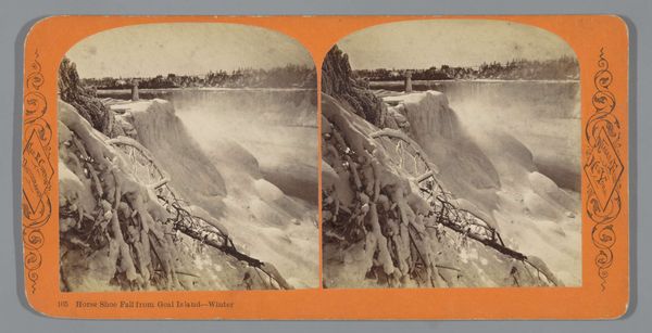Editor: This gelatin silver print, taken by George Barker sometime between 1863 and 1894, depicts "Ice Floes near a Large Wooden Stairway next to the American Falls." It's incredibly stark. The monochrome palette really emphasizes the imposing nature of the falls and the fragility of the temporary structures around it. What historical context shapes your view of this piece? Curator: It's fascinating how this photograph speaks to the intertwined histories of tourism and industrialization. By this period, Niagara Falls had become a prime tourist destination, but also a site of intense industrial activity. This photo offers a window into how infrastructure, like that staircase, was built to both accommodate and control the viewing experience of the sublime. Editor: Control? That’s interesting. Curator: Absolutely. Think about it: who was this staircase for? Was it equally accessible to all? Photographs like this often played a role in shaping a specific *kind* of public encounter with the natural world, frequently one that catered to a certain class or race. Consider the indigenous populations who originally lived on this land, and their relationship to Niagara Falls, versus the spectacle presented in this photo for tourists. Does the image seem like it prioritizes a romantic, individualized experience of nature? Editor: It definitely does, now that you mention it. There's a sense of grandiosity and almost conquering nature with this staircase clinging to the landscape, offering a very directed view. It almost feels less about nature and more about the human attempt to capture and commercialize it. I hadn't thought of it that way initially. Curator: Exactly. So when we look at this seemingly straightforward landscape photograph, we can actually unpack a whole set of social and political relations encoded within its composition. Editor: This has totally changed my understanding of the photo! It's not just a pretty landscape; it's a document of its time and all its complexities. Curator: Precisely. And hopefully, it sparks more questions than answers.