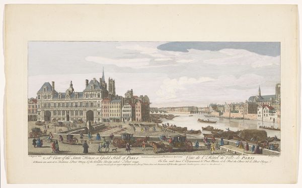 This print, "View of the Town Hall and the Seine River in Paris", was made by an anonymous artist, using ink on paper. The image gets its impact from the precise lines etched into the plate, giving clarity to the buildings and figures. After the printing process, the print was hand-colored, which softens the appearance and adds to its charm. While we don’t know who made this print, it would have been the product of skilled labor. Printmaking was a key industry in early modern Europe, with workshops producing images in multiples. This made art more accessible and helped spread ideas widely. The artist's focus on the architecture and bustling street life speaks to the rising importance of cities. These prints offered a glimpse into urban life, inviting viewers to imagine themselves in these busy metropolises. Considering the materials and methods used, this print offers insights into both the artistic practices and the broader social context of its time.