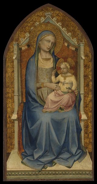 Editor: Niccolò da Foligno's "The Madonna Enthroned" presents a dignified Madonna surrounded by saints. I’m struck by the contrast between the serene faces and the rather rigid composition. How do you interpret the social significance of this piece? Curator: It’s crucial to consider the role of religious imagery in shaping social values. Niccolò’s Madonna presents a vision of divinely sanctioned authority, doesn't it? Who do you think commissioned it and what messages were they aiming to convey? Editor: Perhaps a wealthy patron wanting to display their piety and status? Curator: Precisely. This work acted as a visual reinforcement of the Church's teachings and a demonstration of the patron's allegiance. Notice how the arrangement positions Madonna as an intercessor between the divine and the earthly. Editor: That’s a fascinating perspective! I hadn't considered the artwork as a tool for social conditioning. Curator: Reflecting on the power dynamics embedded in the image can really change the way you perceive art. Editor: I’ll remember that. Thanks!