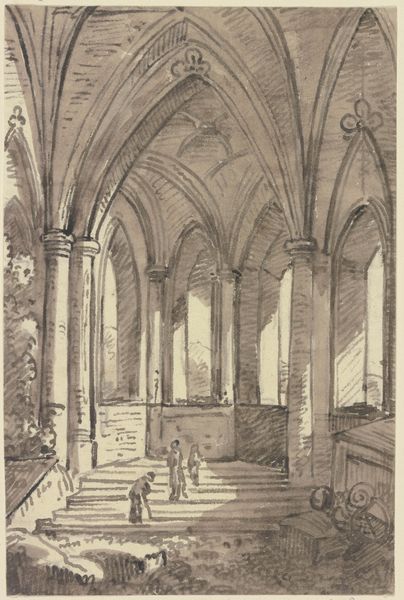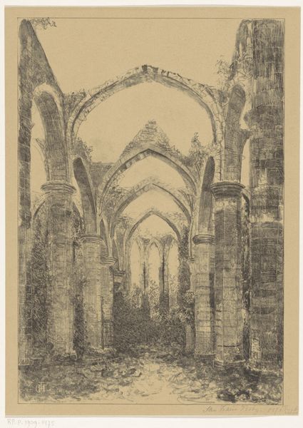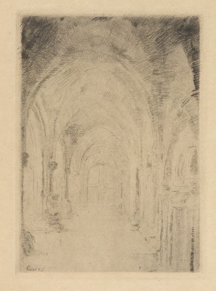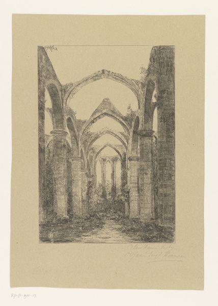 Curator: Today we're looking at Hendricus Nicolaas Johannes Eernink's "Zijbeuk van de Grote of Sint-Bavokerk in Haarlem," a 1925 etching. It's a strikingly detailed interior scene. Editor: It has an almost haunted quality to it, doesn't it? All those heavy shadows and soaring arches, drawn with such deliberate linearity. I feel a strong pull into the space. Curator: Absolutely. I'm intrigued by Eernink’s choices in process. Etching, with its reliance on acid and controlled decay to produce a reproducible image, seems apt to portray a site, like a church, so embedded in history, construction, and material transformation. The work itself is a form of social documentation, mediated by a deliberate process. Editor: Yes, and note how the artist manipulates light and dark; a true study in chiaroscuro. It gives the piece a depth, almost theatrical, that highlights the formal architectural elements—the arches, the pillars, and the vaulted ceiling—giving emphasis to the construction. It really speaks to a semiotic understanding of space. Curator: Right, this wasn’t a simple reproduction. Think of the labour invested, both physical and intellectual, into its making! The church itself embodies collective effort—consider its history, perhaps impacted by war and its impact in this etching through realism? Editor: Indeed, while realism grounds us, the ethereal rendering creates an almost otherworldly atmosphere. It’s more than just architectural accuracy; it’s the suggestion of grandeur but at the same time intimates a sense of decline, perhaps reflecting larger shifts in societal belief. Curator: I agree. Seeing this now prompts contemplation regarding faith and labor in interwar Europe, and about print production within the art world and its significance for wider access. Editor: Ultimately, Eernink delivers us not merely a depiction of a cathedral aisle but a visual essay that invites our introspective regard and consideration of our collective cultural ethos.