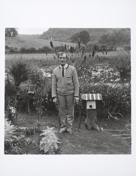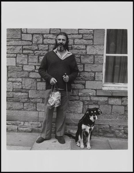 Curator: There’s something so wonderfully bleak about this image—the harsh black and white, the scraggly grass, and that stone wall receding into the background... it's like a still from some forgotten Eastern European film. Editor: This is "Walking the Dog," by Keith Arnatt. Arnatt, who lived from 1930 to 2008, often explored the mundane aspects of everyday life, and this photo, part of the Tate collection, certainly fits that bill. Curator: Mundane, yes, but it’s the way he captures it! The guy’s expression is pure existential dread—even the dog looks a bit miserable. Is it just me, or does it feel like a commentary on post-war disillusionment? Editor: Perhaps, but Arnatt was also very interested in the role of photography itself, how it can both document and distort reality. By presenting this seemingly ordinary scene, he invites us to question what we consider "art." Curator: I suppose that’s the genius, isn’t it? Finding the extraordinary in the ordinary. This photograph, it’s a silent poem about the quiet moments of life, the kind that usually go unnoticed. Editor: Indeed. It prompts us to consider the social and political implications of capturing these overlooked moments. Who gets to be seen, and why? Curator: And how often do we truly "see" what's right in front of us? Editor: Food for thought, indeed.