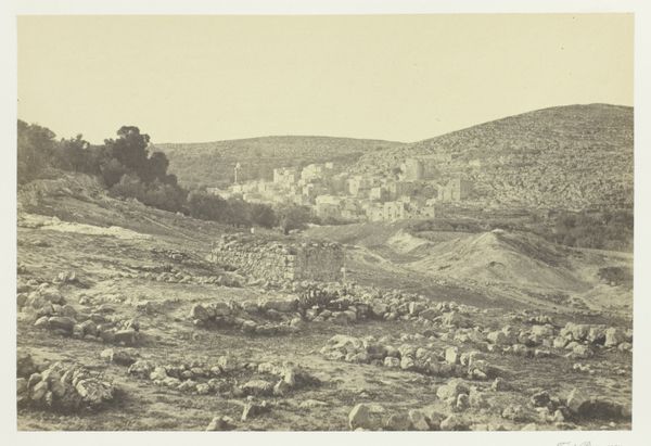 This albumen print, made by Auguste Salzmann, presents a view of Jerusalem. The stark contrast between light and shadow immediately grabs our attention. The composition is structured around a careful arrangement of horizontal planes, emphasizing the terrain’s undulating form. The light, almost uniformly distributed across the scene, gives the impression of a landscape bathed in a soft, diffused glow. The textures vary from the smooth sky to the rough, rocky earth, creating a tactile quality. Salzmann’s choice of albumen print, with its capacity for capturing fine detail, allows him to document the topography with great accuracy. However, beyond mere documentation, the photograph engages with deeper themes. By meticulously recording the geological features and ancient ruins, Salzmann seems to be investigating the relationship between the land and its historical narratives. The repetitive patterns of stone and vegetation evoke a sense of timelessness, inviting reflection on the layers of history embedded within the landscape. The stark materiality of the rocks, combined with the subtle gradations of light, transforms the photograph into a space of contemplation, where the tangible world meets the ethereal.