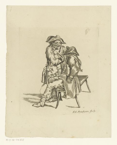Curator: Welcome! Today, we’re looking at Carl Morgenstern’s "Studienblatt römische Bauern", a pencil drawing created around 1836. Editor: Immediately, I'm struck by the simplicity and directness of this drawing. The light pencil strokes and open composition give it an intimate, almost ephemeral quality. Curator: Indeed. Morgenstern's work gives insight into the rising popularity of genre paintings in the 19th century, feeding the burgeoning romantic notions surrounding peasant life in Italy, and was influenced by similar depictions in earlier Dutch Golden Age art. His choice of subject is noteworthy considering the burgeoning middle-class art market. Editor: I see it a bit differently. I am interested in the figures. Consider the weight and position of the first peasant sitting casually by his presumably worn out shoes as he prepares to eat and compare that with the stance of the other who stands, hat proud and head tall holding the cane. Notice the artist carefully and selectively uses shadows around the edges of each character as well. There are intentional and visually impactful decisions here, from the placement of light to the positioning of his subjects. Curator: That attention to detail reflects a wider European interest in rural life, presenting romanticised portrayals divorced from the grim realities faced by agrarian workers—it's fascinating how these images were consumed as picturesque fantasies. Editor: Picturesque is one way to put it, though the bare rendering begs to differ. Observe how the thin lines allow you to observe every curve and line on their coats. We're looking at sketches here that emphasize basic shape above else, giving life through geometric presentation. Even his style has geometry here. Curator: Absolutely. This sketch sheet represents a vital document of a particular socio-cultural moment. Editor: And it delivers an example in rendering depth, the weight of shape, line quality, and texture, all to draw our eye towards his protagonists. Curator: Thinking about its position in Morgenstern’s oeuvre gives insight into how these pieces contributed to a wider trend within landscape and genre painting in the early 19th century. The consumption and valorization of a bygone ideal is interesting in relation to social and class tension across the continent. Editor: Ultimately, I appreciate how Morgenstern distills form down to its simplest elements, giving the essence and underlying geometric construction from observation without ever leaving out detail. It emphasizes light, material, weight, and depth with impressive formal precision and simplicity. Curator: Agreed. Morgenstern gives us both a glimpse into 19th century romantic visions and art practices through these quick but careful sketches.