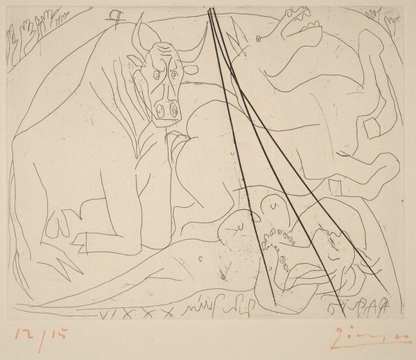 Curator: At first glance, Mark Rothko's ink drawing, titled "Untitled [verso]", feels unsettling, almost fragmented. The stark black lines on the bare paper evoke a sense of incompleteness and tension. Editor: Indeed. There's an intriguing rawness to it. Rothko's embrace of Abstract Expressionism typically focuses on color fields to communicate profound emotions, but here, the simplified lines point to the early figuration of the artist. He creates an unstable interplay between abstraction and recognizable shapes. How does this "verso," or reverse side, challenge the grand narrative of his established art? Curator: Precisely, and that's where its power resides. I believe the deliberate obscuring and simplification speaks to a broader struggle with identity, reflecting anxieties of postwar American society – anxieties deeply entrenched within psychological displacement that often surfaces as deconstructed archetypes in visual language. These symbols may be familiar— limbs, a torso— but they seem trapped, incomplete, as if they’re emerging or receding from the canvas, like phantoms caught in a moment of self-reflection. Editor: Considering the period's prevailing unease, viewing "Untitled [verso]" through that historical lens, what could these dismembered limbs signify beyond personal turmoil? Rothko's contemporaries like Pollock and de Kooning reflected on cultural trauma and mass societal anxieties. Does "verso" also comment on socio-political fragmentation through the abstracted body? Curator: I agree completely; the universality of body language is something which transcends language barriers. The simplification of each line, however bold, feels fragile. Its bareness also alludes to that historical context through an invocation of universal motifs or an unraveling symbolic order: where society at large mirrors this feeling. The 'verso' could then be seen as an 'other-side' or shadow element: The subconscious is the shadow to civilization as society becomes more 'modern', in a state of flux and trauma after great wars or cataclysmic change. Editor: In short, it functions as an artistic prelude, allowing access into the social contexts affecting Rothko while granting a privileged glimpse into the evolution of one of the 20th century's masters. Rothko allows us a view behind the veil. Curator: Right, it leaves you pondering not just Rothko's artistic process but the emotional and cultural bedrock that shaped it. Thank you, this art gives so much to reflect on and take to heart!