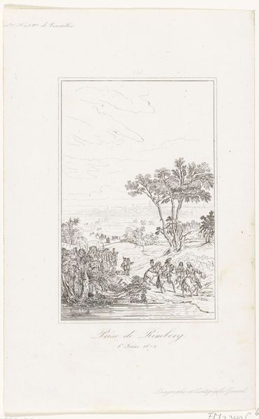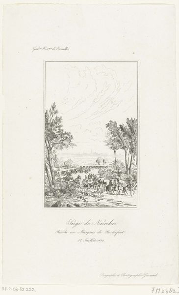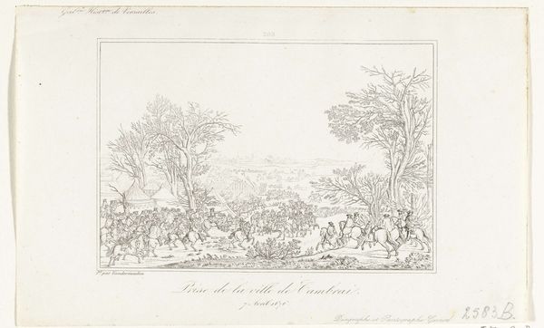 Etienne Acille Réveil made this print, "Inname van Xanten, 1672," sometime in the first half of the 19th century. The image is a product of the etching process, where lines are incised into a metal plate, inked, and then transferred to paper under great pressure. The fine, linear quality of the etching perfectly suits the depiction of this historical scene: soldiers on horseback, a landscape with trees, and in the distance, the city of Xanten. Look closely, and you'll notice the way the artist modulates the lines to create a sense of depth and atmosphere. Etching was a favored technique for disseminating images widely. It allowed for the relatively efficient production of multiple copies, making art and information accessible to a broader audience. The print medium itself, therefore, speaks to a social context where the circulation of knowledge and historical narratives was increasingly important. Far from being a neutral vehicle, it's a testament to the democratizing potential of art.