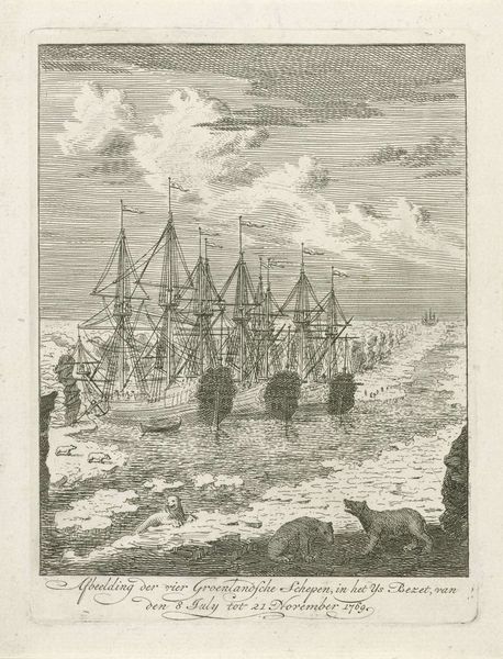 Editor: Here we have Reinier Vinkeles' engraving, "Zeeslag bij Kamperduin (aanvang), 1797", created in 1798, and currently residing in the Rijksmuseum. It's an incredible scene filled with ships, but feels somewhat...static. All these ships lined up, seemingly waiting. What do you see in this piece? Curator: I see a frozen moment pregnant with meaning. These aren't just ships; they're vessels of cultural and national identity, about to collide. The careful, almost scientific depiction echoes the Enlightenment’s emphasis on reason, yet the subject, naval warfare, represents the passions and conflicts that rationality struggles to contain. Note how the rigid lines of the ships contrast with the churning water, suggesting the controlled chaos about to unfold. How does the composition speak to you? Editor: It’s interesting you mention control versus chaos. The order of the ships gives an initial sense of control, but I also see a ton of hidden anxiety in the tiny details of the waves, it feels very active. Curator: Exactly. Those "tiny details" carry significant emotional weight. Think of the sea as a powerful, often unpredictable, force throughout human history. Vinkeles captured this duality. Also, the Dutch identity had always been bound to the sea, therefore this moment encapsulates not just a naval battle, but also a national struggle. This symbol is quite powerful. Editor: That’s such a good point. So the waves symbolize instability, or the impending battle itself, and the ships perhaps symbolize an attempt at mastery of destiny or, perhaps, an established power? Curator: Precisely. But are they succeeding? Does the artist hint at an ultimate victor in this work? Perhaps what appears solid and structured is more vulnerable than we think? Editor: I hadn't considered that. Seeing how this event shaped Dutch identity and collective memory, the symbolism of the piece resonates much deeper now. Curator: Indeed. Art serves as a time capsule, holding layered meanings for those who learn to decipher its symbols.