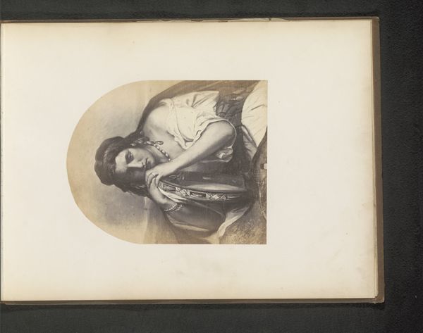 Editor: Here we have a page from "The Madame B Album," likely from the 1870s. It features an albumen print of Marie-Blanche Hennelle Fournier. The gilded frame around the photo gives it a performative air, almost like a stage. What draws your eye when you look at this piece? Curator: My attention is immediately drawn to the albumen print itself. Think about the process involved: the labor to create the photographic negative, the manipulation of the albumen to create the print, the careful layering involved. Then consider this photograph isn't presented alone, it's meticulously placed within an album. What does this framing tell us? Editor: Perhaps it elevates the status of the photograph? Like it's precious? Curator: Precisely! The very act of placing a photograph, typically considered a more democratic art form, within such a gilded, ornamented frame pushes us to consider the social and economic context. Who had access to this level of photographic production and presentation? Whose labor went into the creation of each part - the photography and the elaborate mounting? Editor: It’s interesting how the photograph feels almost secondary to the presentation. Curator: Exactly! The "Madame B Album" challenges the conventional hierarchy between the image and its presentation. It pushes us to see the album itself as a crafted object, a site of meaning production that's just as vital, perhaps even more so, than the individual photographic images themselves. Editor: So, it's not just about *what* is being presented, but *how* and *why* it's being presented in this particular way. Curator: Precisely. It makes us question the relationship between the subject, the photographer, and the consumer of this image, thinking about how power dynamics are manifested in this entire process, start to finish. Editor: I see it now. Looking at the albumen and the frame this way makes me see the entire piece in a new light, really.