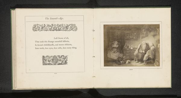 This print by J. Landy depicts an elderly man from Shakespeare's "As You Like It." The sepia tone and composition evoke a sense of quiet contemplation. Notice how the artist uses a confined space to emphasize the figure's stillness. The man, seated and seemingly lost in thought, is framed by the architecture behind him. The light softly illuminates his face and hands, drawing our attention to these key areas. Landy employs a semiotic language, with the helmet hung in the background potentially signifying past vigor, now contrasted with the man's present state. The texture is rendered with delicate precision, capturing the details of fabric and facial expression. This textural detail serves to humanize the subject. The artwork prompts reflection on the themes of aging, memory, and the passage of time, inviting endless interpretations.