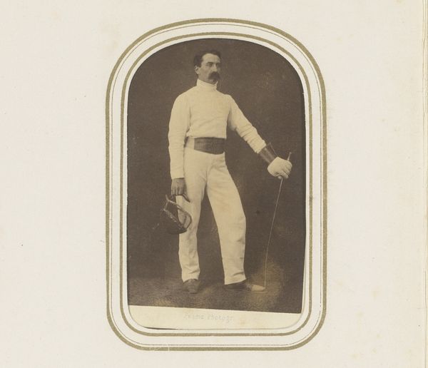 Curator: What an intriguing sepia photograph! At first glance, I see echoes of sepia dreams and perhaps, an early advertisement for Panama hats? Editor: It certainly strikes a colonial chord. The portrait, taken by Hung Wan Foong in Penang around 1890-1900, captures three young men in, shall we say, impeccable colonial attire. That pith helmet practically screams "rule Britannia." Curator: Impeccable indeed! There’s a formality here, of course, but also something quite charming. Look at their carefully cultivated mustaches and confident stances—it's as if they’re staging their own little theater of empire, don't you think? I wonder about the context: the tropical heat contrasting so sharply with those heavy wool suits... was it all terribly performative? Editor: Precisely! The very act of meticulously constructing this image speaks volumes about the performance of identity under colonial rule. Who were they trying to be, and for whom? Notice also the Chinese characters and English text below the image – a deliberate positioning that would invite viewers in different markets to appreciate. Curator: Oh, I love that perspective. But beyond the broader socio-political implications, what stories might be woven within? Perhaps each hat a symbol for individual dreams – the artist, the adventurer, the diplomat. Their outfits seem deliberately matched but look closely. A slightly different hat and jacket give us insight into their personality? I cannot help wonder, for example, what role each one of these individuals played in constructing, maintaining, or perhaps resisting the colonial infrastructure around them! Editor: An essential question! While their crisp white garments certainly hide a world of nuance and contradiction, those outfits are, ultimately, also blinding in how they homogenize individuality in favour of the 'civilized' appearance that colonial powers desperately needed to justify their violent project. This studio portrait of well-to-do men, therefore, invites crucial critical reflection – whose story has traditionally gone unphotographed and untold? Curator: A powerful point. The unrepresented stories framing the represented one. Now, when I look at the artwork, I'm thinking about where photography sits within this landscape of memory, and whether photography helps people preserve an otherwise ungraspable idea. Editor: That lingering question of photographic (in)accuracy should prompt us to reimagine alternative narratives within the context of coloniality.