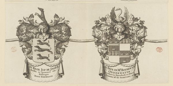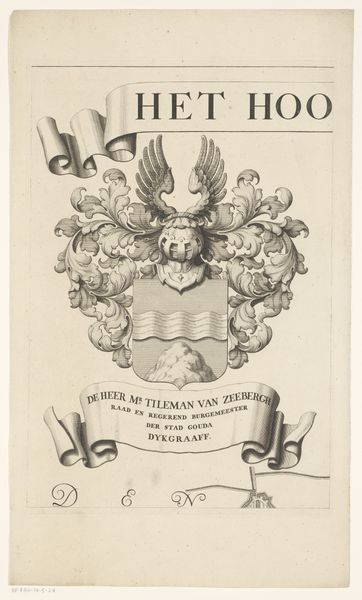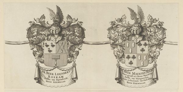 Curator: Standing before us is "Wapenrand van een kaart van de Alblasserwaard en de Vijfheerenlanden (deel)," or, Border of a Map of the Alblasserwaard and Vijfheerenlanden (part). It’s an intaglio print dating back to 1716. Editor: Wow, that’s quite a mouthful. The Alblasserwaard and Vijfheerenlanden—sounds like something straight out of a fairytale. Anyway, the thing that strikes me first is this overall feeling of controlled chaos. It’s incredibly intricate, almost overwhelmingly so, but contained within very deliberate boundaries. Curator: Precisely. The baroque style, characterized by its exuberance and drama, is certainly on full display here. Consider the dense arrangement of leaves, scrolls, and that fierce eagle perched atop the helmet. And yet, the artist masterfully balances the composition, directing our gaze toward the central coat of arms. Editor: Speaking of the coat of arms, those double-headed eagles give off a "Game of Thrones" vibe, no? I guess symbolism was everything back then— it’s not just a pretty picture but a carefully constructed representation of identity and power. I imagine it says volumes about Johannes van Asperen—that's his name, if I'm reading that inscription correctly. Curator: Yes, “De Heer Johannes van Asperen, Schout en Secretaris van Streefkerk, Hoog Heemraad.” So, Johannes van Asperen, Bailiff and Secretary of Streefkerk, and High Counselor. A man of considerable importance. The formal qualities, the symmetrical design and controlled execution are interesting from a purely aesthetic perspective, however I do find that cold and limiting, not quite considering what’s been put into it from a creator’s standpoint. This print could represent a connection to history or ancestral pride for Johannes. I feel a strong personal meaning deeply entwined with place—with that area called the Alblasserwaard en Vijfheerenlanden. Editor: Absolutely! Maybe this print reminds me to dive beneath surface-level assessments in everything that I see from now on, to uncover something of depth or some sort of history. Curator: A fruitful insight. A map isn’t just a grid. Even a heraldic image can hold stories if we care to look closely.