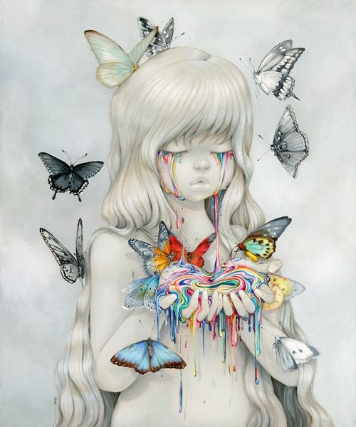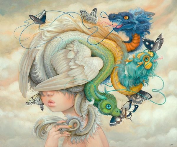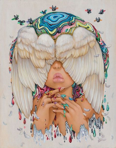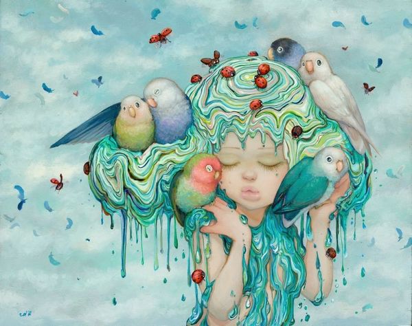 Camilla d’Errico's "Ophelia," of the 20th or 21st century, presents us with a contemporary take on a classic subject, rendered with a modern sensibility. The image blends elements of fantasy and melancholy, reflecting a shift in cultural attitudes towards representations of women. The subject is Ophelia, but she is adorned with birds in crowns and surreal rivulets of liquid emanating from her head. How can we interpret this? The image can be read as a comment on the weight of cultural expectations and the pressures faced by women in contemporary society. The birds might symbolize external forces or voices imposing their will on the individual, their tiny crowns suggesting a distorted sense of authority. The rivulets might represent an emotional overflow, a breaking point beneath a veneer of composure. To fully understand the artwork, we might consider the artist's background and the cultural context in which she operates. In what ways does "Ophelia" challenge or subvert traditional representations of women in art and literature? Examining critical texts, artists' statements, and historical sources can enrich our appreciation of the artwork's significance.