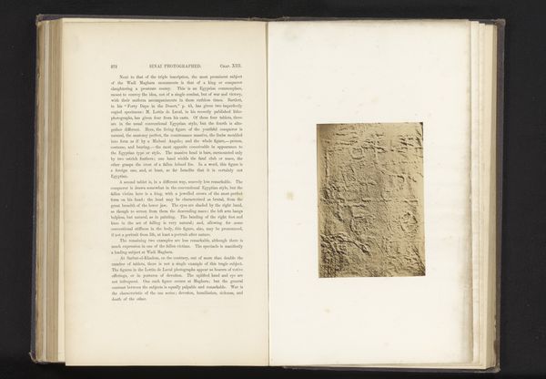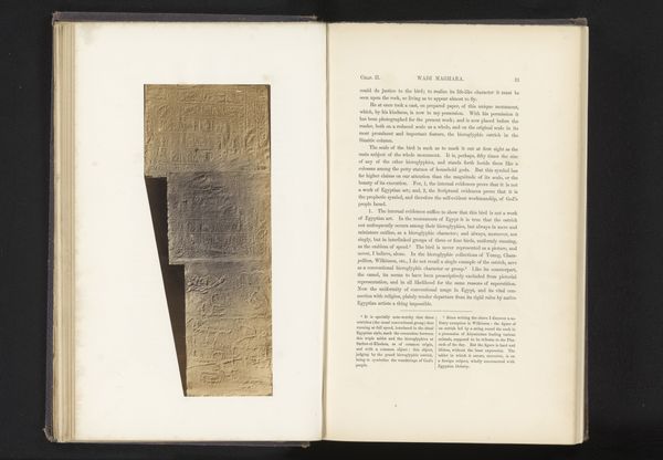 This is a plaster cast of a tablet with hieroglyphs, created by A.J. Brown, replicating an artifact from Wadi Maghareh or Sarabit al-Khadim. The image speaks to the surge of interest in Egyptology during the 19th century, and the ways in which ancient cultures were being documented and interpreted through the lens of European scholarship. The tablet itself, now reproduced, points to the cultural and religious practices of ancient Egypt, but its reproduction and circulation as a plaster cast reflect the institutional practices of archaeology and museum studies in Europe. This was a time when European powers were expanding their reach across the globe, often appropriating cultural artifacts under the guise of scientific inquiry. Understanding this image, therefore, requires us to consider both the original context of the hieroglyphs and the social conditions that led to its reproduction. Historical resources, such as excavation reports, museum archives, and travelogues, can provide valuable insights into the complex interplay between ancient cultures and modern institutions.