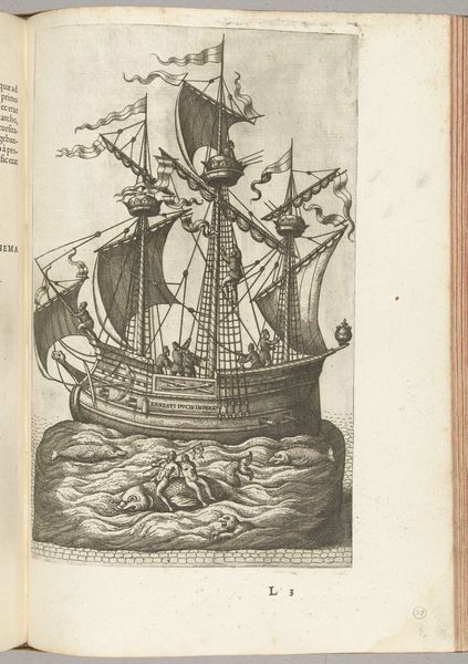 Roemer Visscher created this engraving titled "LIV His Alis" sometime before 1620. Note how the pictorial space is divided into halves – a block of text on the left, and on the right, an image of a ship at sea contained within a border. The ship in the image is rendered with a formal exactness. Look closely at the detailing of the sails, the rigging, and the hull, each delineated with clear, precise lines. The waves, too, are depicted with a repetitive pattern of curved strokes, lending a sense of rhythmic movement to the scene. The image suggests a controlled, almost mathematical, approach to representing the natural world. Visscher juxtaposes a textual narrative alongside the image of the ship as a visual metaphor of his themes. His use of structured, linear forms, and the clear separation of text and image, underscores a world seen through the lens of order and reason. The artwork invites us to contemplate how structure and representation interact to create meaning.