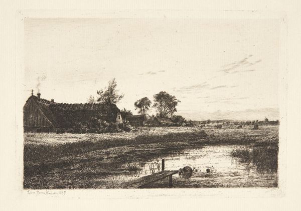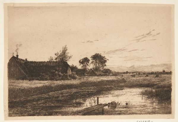 Editor: This is Louise Ravn-Hansen's 1889 etching, "Evening at a Zealand Farm." It feels very still and quiet, almost melancholic in its depiction of rural life. What symbols or images stand out to you in this piece? Curator: I am drawn to the light itself – how it catches the water and illuminates the thatched roof. The smoke rising from the chimney...it suggests not just warmth, but continuity, memory, and even hearth and home, central themes throughout art history and cultural consciousness. Think of it as an anchor to the collective unconscious. Does the angle of the light suggest anything to you about the passage of time and perhaps what activities would typically be associated at dusk? Editor: Well, the setting sun might represent the end of the workday and transition to rest, making the smoking chimney feel even more like a domestic sanctuary. But why is that important culturally? Curator: Consider the era. Late 19th-century Denmark was undergoing significant social and industrial change. Images of rural life became powerful symbols of national identity, of stability amid that change. Doesn't it feel timeless, and do you see this symbolism appearing later in the art canon? Editor: Absolutely, I am thinking of the Arts and Crafts movement and the revival of rural scenes we continue to see today. The farmhouse as a source of warmth, history and security... It is powerful. Curator: It seems that Ravn-Hansen understood how to tap into those deeply embedded cultural memories. I learned from you that such representations live on in other works. Editor: And I learned how to see this piece as more than just a landscape, but as a representation of shared cultural values and memory.