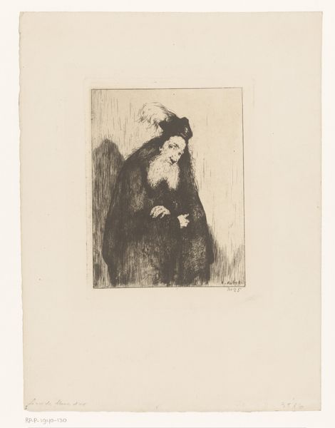 Curator: Here we have Wilhelmus Johannes Steenhoff's etching, "Christus met gesloten ogen", which roughly translates to "Christ with closed eyes." The piece dates from between 1873 and 1932. Editor: The mood of this piece really grabs me. It feels almost unbearably intimate – a kind of mournful tenderness in those closed eyes. It reminds me a little bit of a Rembrandt etching. Curator: Yes, that use of light and shadow is definitely reminiscent of Rembrandt. And notice how Steenhoff focuses solely on Christ's face and upper body. He isolates Christ's suffering in a way that demands our attention. It’s quite powerful given that he uses a printmaking technique for that depiction. Editor: The closed eyes are really interesting. Usually, depictions of Christ emphasize the all-seeing, all-knowing. Here, there's a vulnerability, a quiet surrender. Eyes are often seen as the windows to the soul – to close them suggests a journey inwards, away from earthly concerns and agony. Is it a symbol of grief or of peace? Curator: Perhaps both? Or perhaps it depends on the viewer, on what we bring to the image. Consider the tradition of iconic imagery throughout history. By depicting Christ this way, is Steenhoff aiming to capture universal themes of mortality, hope, and faith in human existence and destiny? Editor: Absolutely! The historical and symbolic burden this image carries is astounding! Steenhoff’s personal anguish seems palpably present here, like the artwork's creation may have served as catharsis. The medium adds to that as the graphic quality underscores his emotion. Curator: You know, it's interesting to consider the time period. Steenhoff was working in a world undergoing massive change. Maybe this is his way of grappling with doubt, with the fragility of faith in an increasingly secular age. Editor: And in doing so, maybe he gives voice to our own doubts, our own moments of quiet questioning. The art, however rooted in a very particular faith, manages to tap into feelings so fundamentally human. Curator: It certainly does give one a lot to ponder. Editor: Indeed. I see something new every time I look at it.