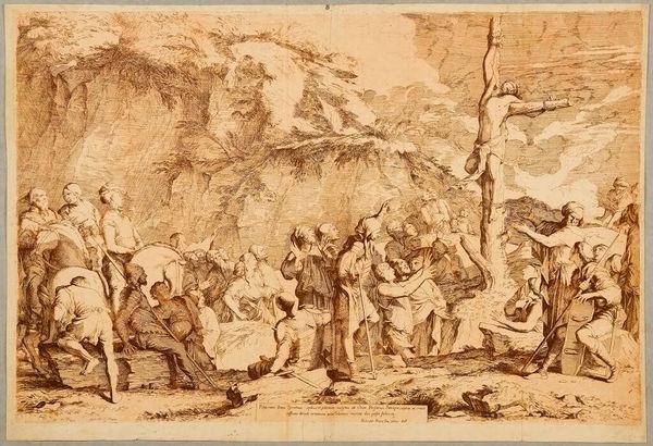 Editor: This is Stefano Mulinari’s "Saint John Preaching in the Wilderness." It's a beautiful sepia drawing. All the figures seem so captivated, yet the setting appears desolate. What do you see in this piece? Curator: The wilderness itself is a powerful symbol. It represents a space outside of societal norms, where spiritual transformation can occur. What emotions does that evoke in you? Editor: It's like a place of raw honesty, far from civilization. Curator: Exactly. Mulinari captures John the Baptist not just as a preacher, but as a figure embodying that disruptive, transformative power. Notice the faces of the crowd—they are a study in human reaction. Editor: I see a lot more now. I hadn't considered the wilderness as a psychological space. Curator: Art opens doors to different ways of understanding.