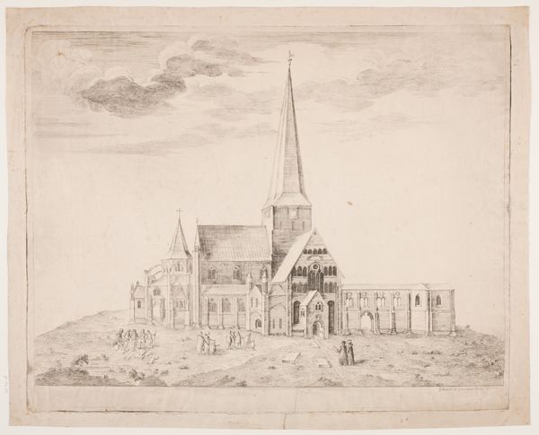Editor: So, this is Joseph Farington's "North-East View of Worcester Cathedral," held at the Tate. It's a watercolor, and what strikes me is the contrast between the grand cathedral and the modest buildings in front. What's your take? Curator: Consider the labor involved in quarrying, transporting, and shaping the stone for the cathedral versus the ready availability of materials for the domestic structures. Note how the artist renders the cathedral's facade with detailed, repetitive lines, emphasizing the skilled craftsmanship, while the houses appear more freely rendered. It almost seems to comment on the social hierarchy embedded within the landscape itself, doesn't it? Editor: That's fascinating; I hadn't considered the labor aspect so explicitly. Curator: By examining the materiality and means of production, we unveil the power dynamics at play during its creation and reception. Editor: It really highlights how art is intertwined with economic realities. Curator: Exactly.