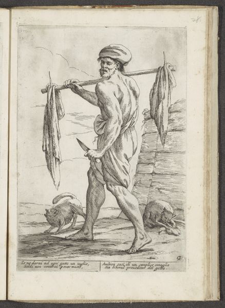 Curator: Let's turn our attention to "Druivenplukker," an etching made around 1660 by Giuseppe Maria Mitelli, held here at the Rijksmuseum. Editor: The first thing that strikes me is the almost caricatured expression on the grape picker's face; a mix of exhaustion and what looks like defiance. And those heavily muscled legs and disproportionately sized feet also suggest a distorted sense of class and labour. Curator: Mitelli was working within a tradition of Bolognese art that embraced both classicism and caricature. Etchings like this often circulated as prints and tapped into the everyday lives of ordinary people, offering social commentary through humour. Editor: Exactly, but it goes beyond simple humor. The tension between the physical labour depicted and the seemingly gleeful expression creates an interesting and even disturbing image, raising questions about the agency, dignity and material comfort of the worker. Are we supposed to be laughing at his labor, or with him? Curator: That's precisely the kind of critical lens Mitelli's prints invite. Looking at the text beneath the image can gives us some clues; in translation the artist states: "That food which is considered divine becomes cheap earnings," Editor: Which reinforces my argument about class. The grape itself becomes a symbolic representation of unequal systems. Despite its divine status the grapes result in a miserable earnings for this worker. We must acknowledge the reality of exploited labour which has so often been made invisible to feed systems of global capital. Curator: That is to say that Mitelli’s "Druivenplukker" offers a window into the complex social and economic structures of 17th-century Italy and the social history around the wine industry. It prompts us to think critically about labor, class, and representation. Editor: Indeed, it invites us to engage with both the historical context and the still very relevant questions of power and exploitation represented by his practice. What seems like an isolated illustration in fact reveals very deep issues, in the artworld as much as in daily work. Curator: Very well put, it makes one realize that a print such as this can invite conversation that brings light to a multitude of institutional forces at play throughout time.