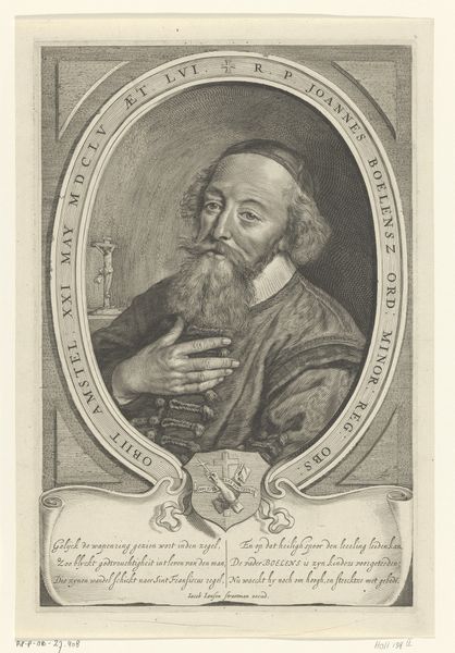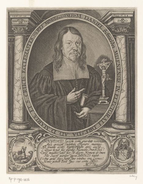 Editor: This is "Portret van Daniel I Schneider" by Johann Alexander Böner, an engraving from sometime between 1665 and 1720, now at the Rijksmuseum. The precision of the line work is striking. How do you approach a piece like this? Curator: From a formalist perspective, it is essential to first analyze the interplay of lines and shapes. Notice how the artist uses varied line weights to create depth and texture, particularly in rendering the sitter’s robes and facial features. Editor: I see what you mean about the robes and face, but also how the pillars are so solid through line and shape. The contrast is impressive. Curator: Exactly. Then, observe the composition; the portrait is framed within an oval, itself set within a rectangular decorative border. How does this juxtaposition of shapes affect your reading of the work? Editor: It compartmentalizes the information almost, setting apart the central figure from other... symbolic elements? Curator: Precisely! These frames within frames create visual layers, guiding the viewer's eye and organizing the different aspects of the sitter's identity and status. We also need to acknowledge the impact of the monochrome palette. The tonal variations achieved through the engraving technique produce an image of considerable richness. What about that intrigues you? Editor: Well, that richness suggests even just one tone offers boundless opportunity if used with rigor, demanding acute observation and an aptitude to interpret the structure of what you’re representing, and find tone within that! Curator: Indeed. By attending to the formal qualities of the engraving – line, shape, composition, and tone – we can start to unpack its complexity and appreciate its artistic merit beyond mere representation. It is an interesting challenge, don't you agree? Editor: It is, and I definitely have a deeper appreciation for what to look for, now!