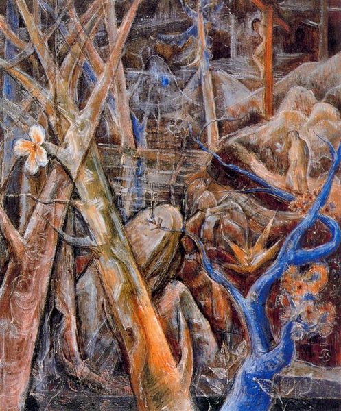 Curator: Looking at Albert Bloch’s watercolor painting "Blue Ravine," what's your immediate reaction? Editor: An almost dreamlike atmosphere. The blue tones give it a melancholic yet contemplative quality. There’s a real sense of immersion as if one were actually wandering within this ravine. Curator: Bloch was, for a time, deeply engaged with Expressionism. "Blue Ravine," while undated, presents an intriguing example of his style. The fracturing of form, combined with the vibrant, almost fauvist color palette, creates a powerful visual tension. How do these elements impact your reading? Editor: The geometric shapes feel primal, recalling natural forces that have eroded landscapes over millennia. The ravine isn't just a geological feature, it’s almost a visual metaphor for the earth’s aging and, perhaps, our own mortality. I am getting an overwhelming connection to earth. Curator: Interesting. Considering the historical context, Expressionism emerged during a period of immense social and political upheaval. Think of the growing anxieties about industrialization and the loss of traditional community structures. Do you see echoes of these societal shifts reflected in Bloch's piece? Perhaps the fracturing mirrors this instability? Editor: Yes, the fractured forms could symbolize a world on the brink, and maybe that search for raw emotional experience of his peers resonates here as well. At the same time, though, aren't we also drawn to representations of natural phenomena and sublime experiences, away from urbanization? Bloch's watercolor speaks to those desires too. Curator: I agree. It's important to avoid limiting art to reflecting trauma alone. Expressionism could offer possibilities for seeking catharsis and re-envisioning alternative forms of being. I think the deliberate choice to render this ravine, however abstract, points to a search for enduring presence and some solace. Editor: Right, so perhaps Bloch is revealing a psychological landscape of the modern human condition through this image—simultaneously burdened by instability, and hopeful of refuge in the enduring beauty of nature. That interplay gives it power. Curator: It does, yes. Ultimately, "Blue Ravine" allows us to reconsider the past in conversation with our current moment. Editor: An evocative experience and truly worthwhile observation.