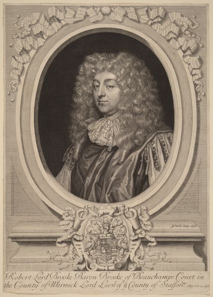 Curator: This engraving by Michel Lasne depicts J.-B. A. Vignerod, presented in a classical oval frame filled with symbols of learning. It exemplifies the Baroque style with its rich details and dynamic composition. Editor: I'm struck by the young man’s placid gaze, which seems almost too knowing for someone so youthful. And surrounded by all those academic objects—it creates an aura of immense intellectual potential. Curator: Absolutely. The iconography is dense. Note the books, the hourglass indicating the passage of time, and the globe, representing his wide-ranging knowledge. These objects suggest Vignerod's involvement or aspiration to education and worldly affairs. The coat-of-arms on the book at the bottom tells us a lot about the sitter and his family’s position in society. Editor: Those eagle wings crowning the oval… They impart a sense of elevation, don't they? As if to associate him with higher, almost divine, understanding? It reminds me of the tradition of using birds in portraiture to symbolize the soul's flight or connection to spiritual realms. Curator: Precisely. And Michel Lasne was a key figure in propagating the Baroque portrait, particularly within court circles. The artistic choices were far from arbitrary; instead, these images functioned as carefully constructed public statements. A statement about education, status, lineage... Editor: What's fascinating to me is how these visual symbols persisted over centuries. We continue to understand and imbue similar objects with related meanings – even today. It shows how powerfully embedded these visual cues are in our cultural memory. Curator: Indeed, engravings like this also democratized images, allowing them to circulate broadly. This would influence wider society beyond the aristocracy. It provides a glimpse into the performance of status in early modern Europe. Editor: Looking at this today prompts us to think about the messages embedded within portraiture and consider what symbolic echoes from the past still influence how we interpret individuals in the present. Curator: An excellent point. Thank you for shedding light on the image's enduring relevance through its rich symbolic language.
